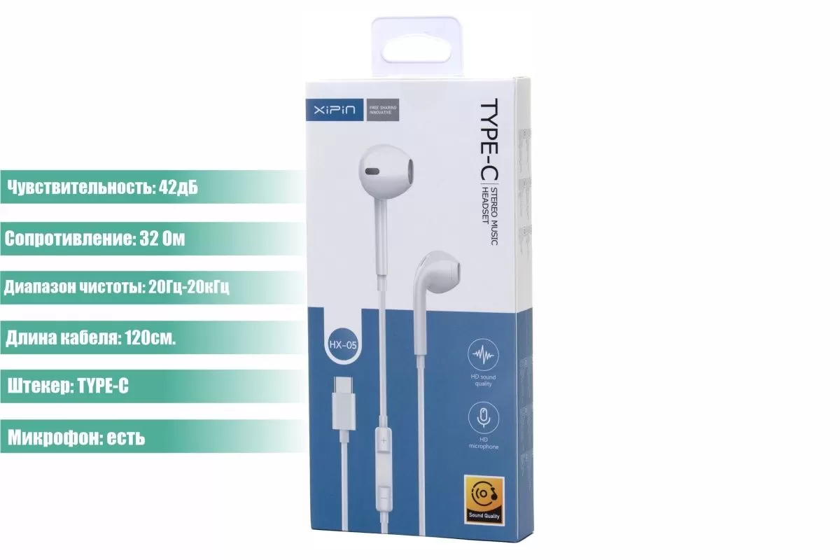 Наушники Xipin HX-05 вкладыши с мк 1.2m Type-C-разъём белый