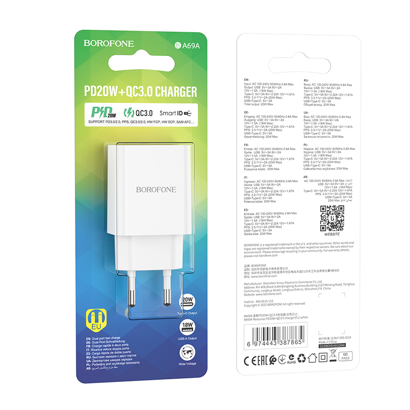 СЗУ BOROFONE BA69A 1USB-C 3.0A PD 20W+QC3.0 быстрая зарядка (White)